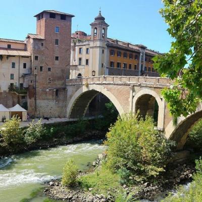 - Vue sur l’ile de la Tiberine, accessible en longeant le quai par un pont piéton (Ponte Fabricio)